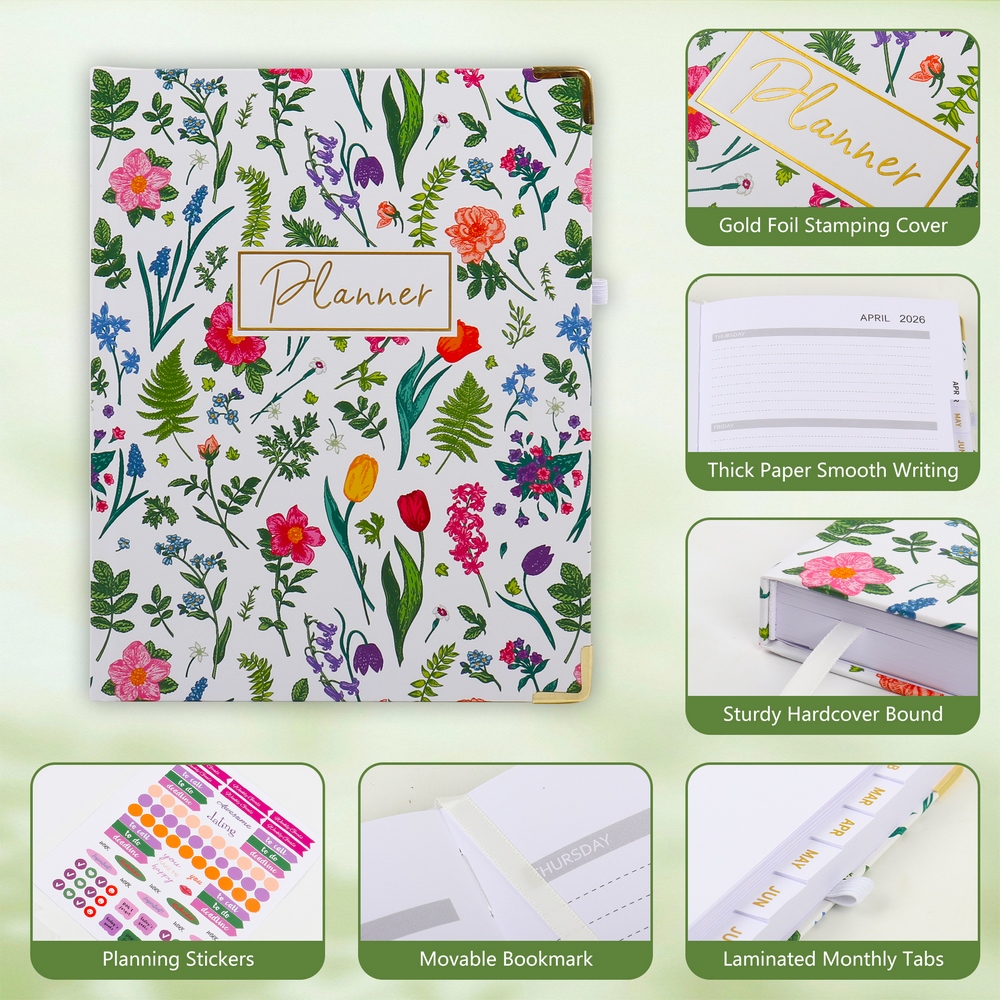 This planner stands out with its customizable elements. The cover, decorated with a lively floral and foliage pattern, can be personalized to your taste. It comes with a gold foil stamping "Planner" logo that can also be tailored. Inside, the thick, smooth paper ensures a great writing experience. Along with a sturdy hardcover, a movable bookmark, laminated monthly tabs, and planning stickers, all of which offer room for customization, it's not just a planning tool but a canvas for your unique style, perfect for organizing your life in a way that's truly your own.
