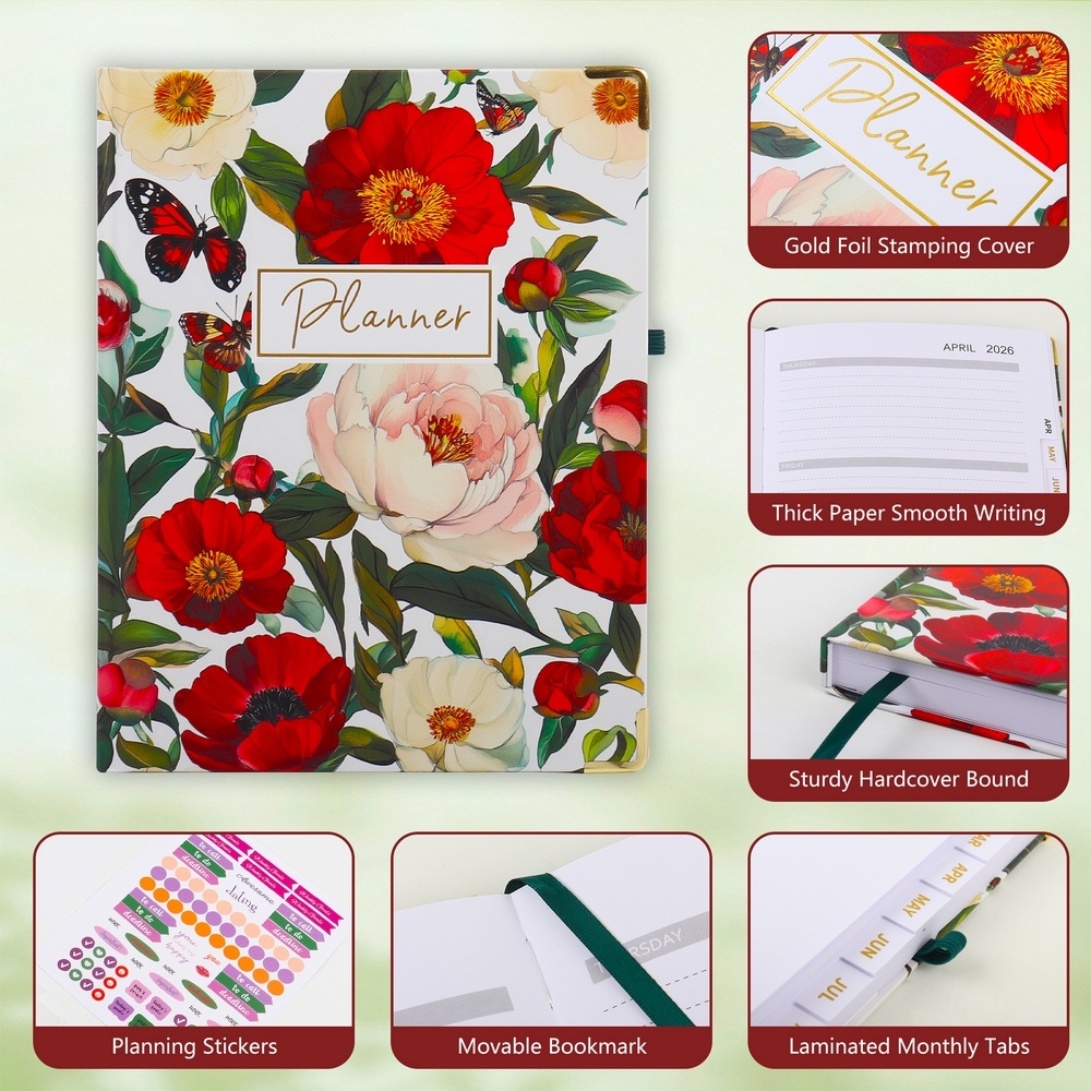 This planner is ideal for both personal customization and bulk orders. It has a cover with vivid peony and butterfly patterns, plus a gold - foil - stamped "Planner" logo, all customizable to fit your brand or personal style. Made with thick, smooth paper, a sturdy hardcover, a movable bookmark, laminated monthly tabs, and planning stickers, it ensures a great planning experience. Whether for personal use or business giveaways, its customizable elements and suitability for bulk production make it a top choice.